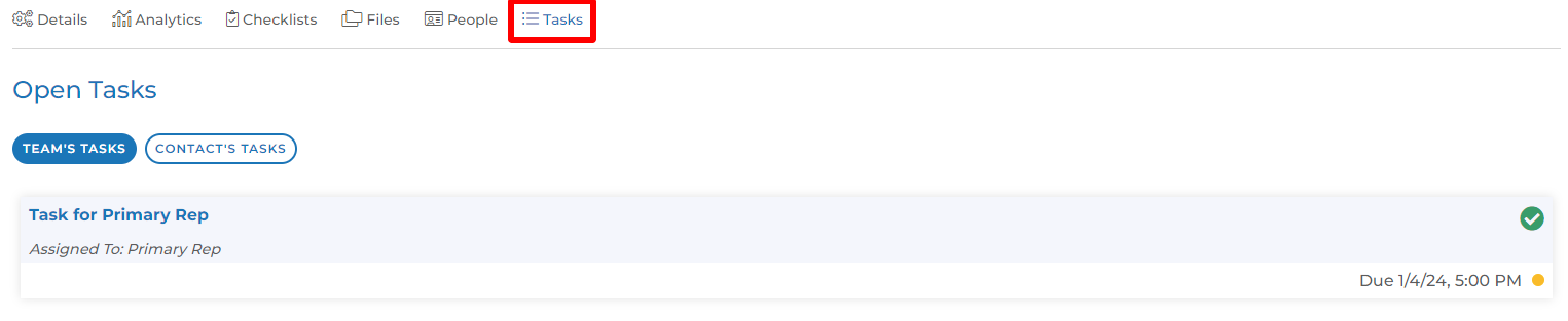 - The Team's Tasks tab shows tasks assigned to any rep inside this workspace (any user inside the "our team" section of the People tab)