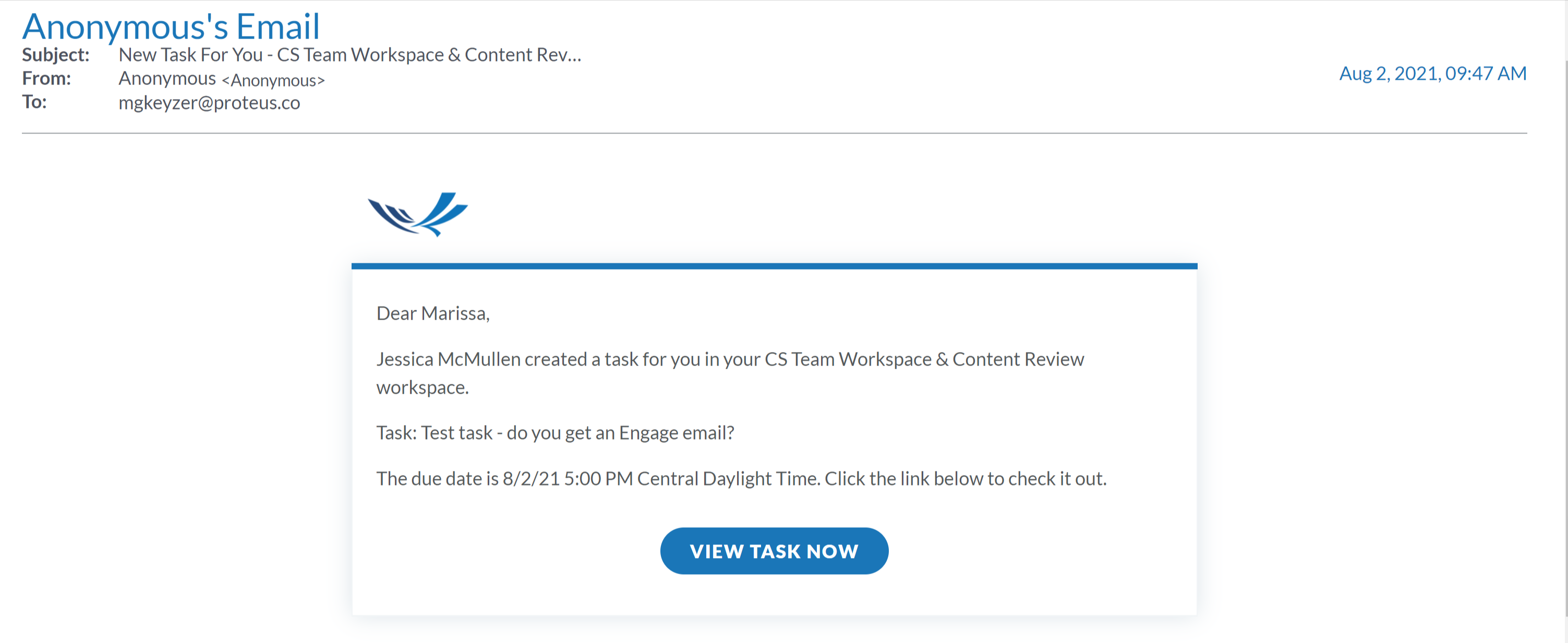 - After you click Save, the person who was assigned will receive an email alerting them that a task has been created for them (see example below)