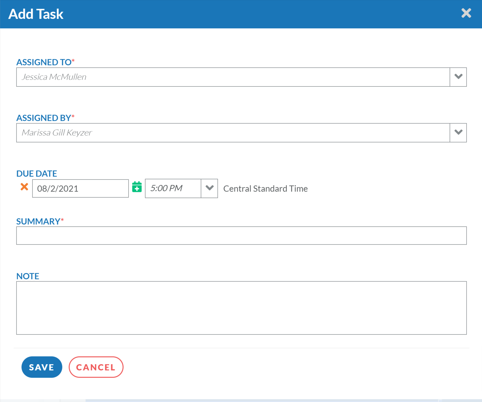 - Once you have clicked on the +Task button, a pop up will appear where you can fill in all of the necessary information: person assigned, person doing the assigning, date due, summary, and notes.