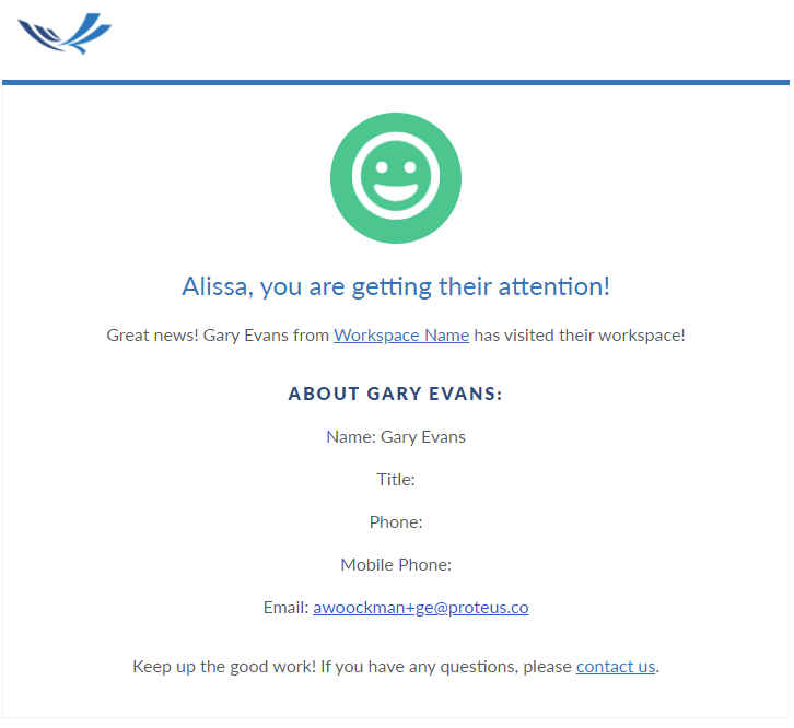 This email notification includes the name of the contact that visited, basic contact information about the contact that visited, and the name of the workspace they belong to.