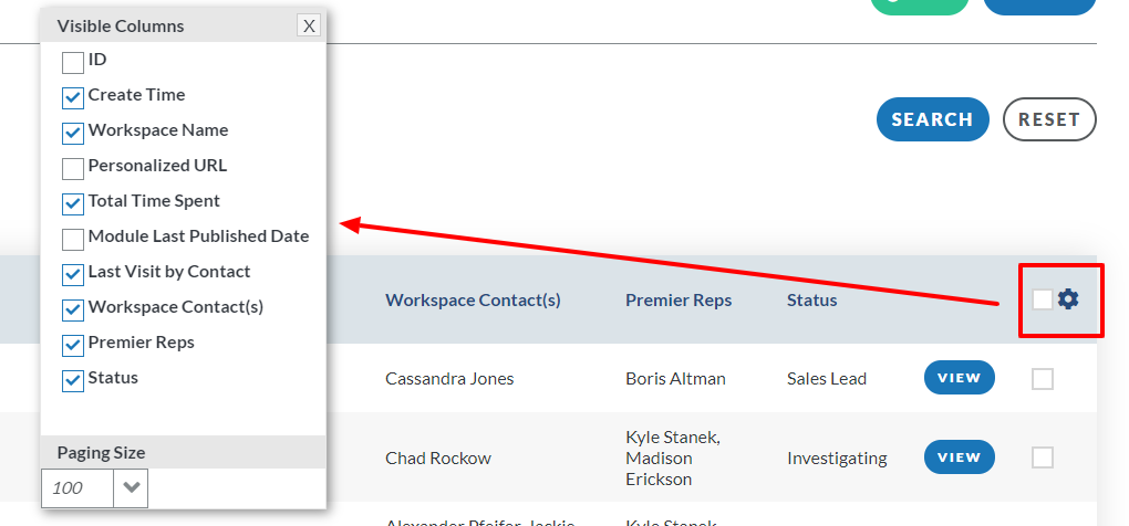 By clicking the gear icon on the right side of the table, a pop-up box will allow you select which columns you would like to be visible on your Workspace Listing page. This way you are able to personalize your view of information that you find necessary at first glance. Every user can independently choose which columns work best for them.