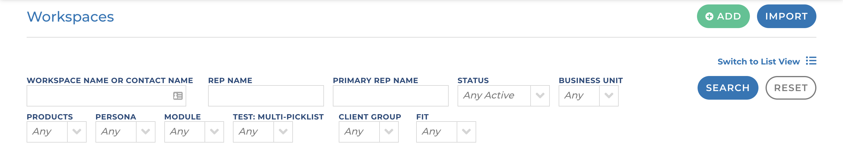 If your workspaces are segmented with labels, such as industry, product, persona, etc., your Workspace Table View search will include additional search filters, such as the below example. You can use these filters to narrow down your workspace search.